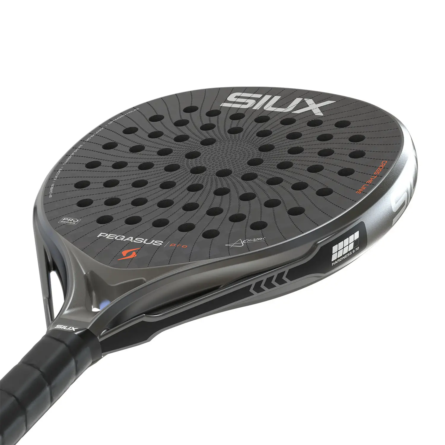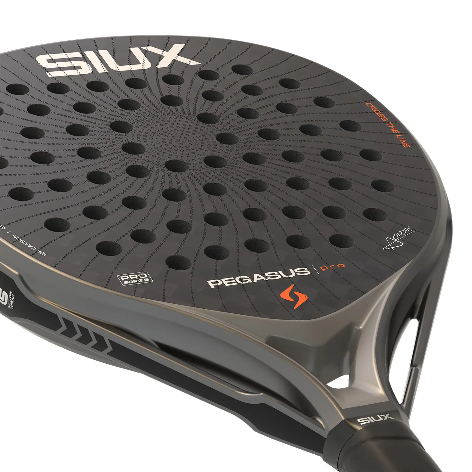 Siux Pegasus Pro 2026 Storm Grey este o rachetă concepută pentru jucătorii profesioniști care caută putere, precizie și stabilitate la fiecare lovitură. Designul său sobru și elegant, în nuanță storm grey, reflectă forță și echilibru, iar finisajul mat cu textură 3D îmbunătățește aderența asupra mingii și oferă un plus de control pe teren. Face parte din gama avansată Siux și este semnată de jucătorul Álex Chozas.